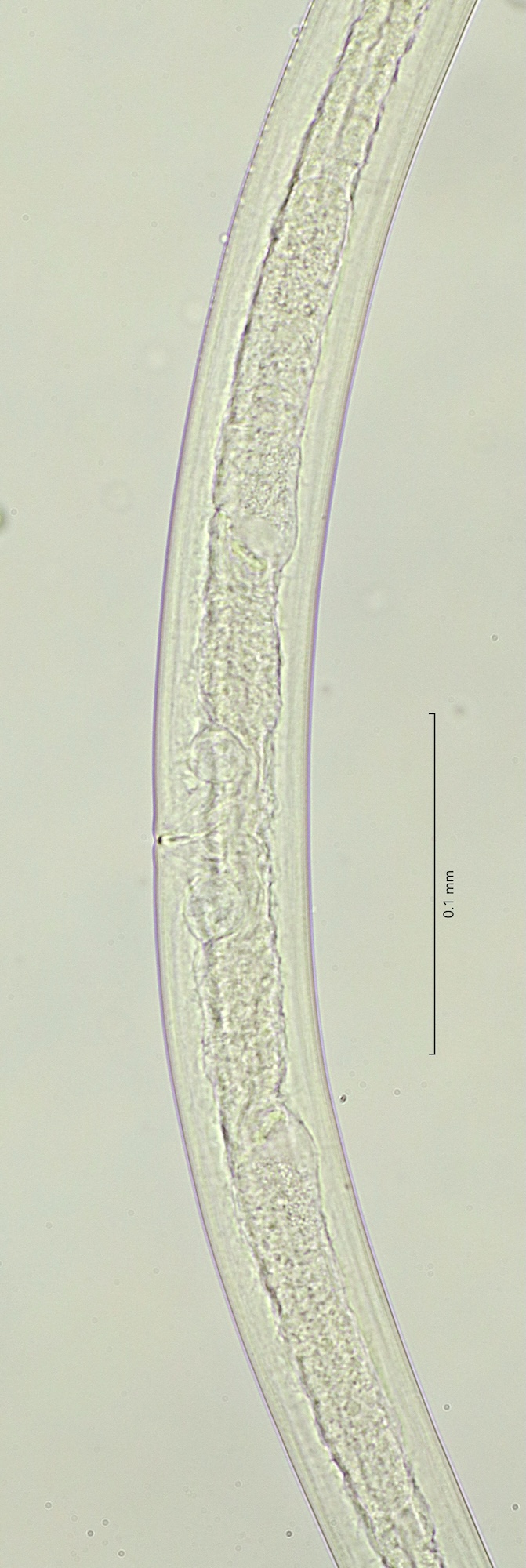 Buccal cavity depth 13mu, cephalic setae 8 mu, amphid diameter 0,2 cbd, positioned at 23 mu (2 hd) from front end. Cylindrical part of the tail 62%.